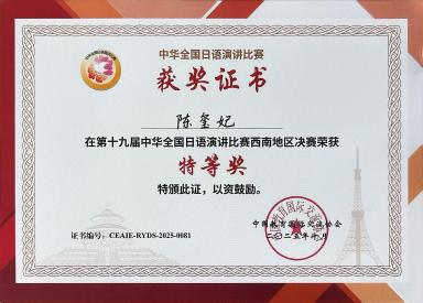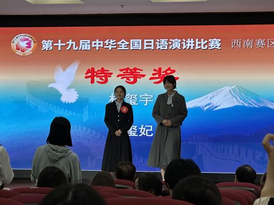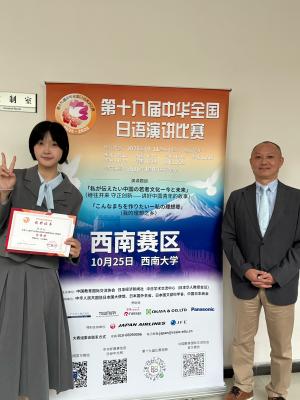10月25日,第十九届中华全国日语演讲比赛西南赛区在西南大学举行。我校2023级陈玺妃同学与西南地区30名选手同台竞技,最终以总排名第二的优异成绩斩获特等奖,并获得赴东京参加总决赛的资格。村瀬隆之老师获评“优秀指导教师”。