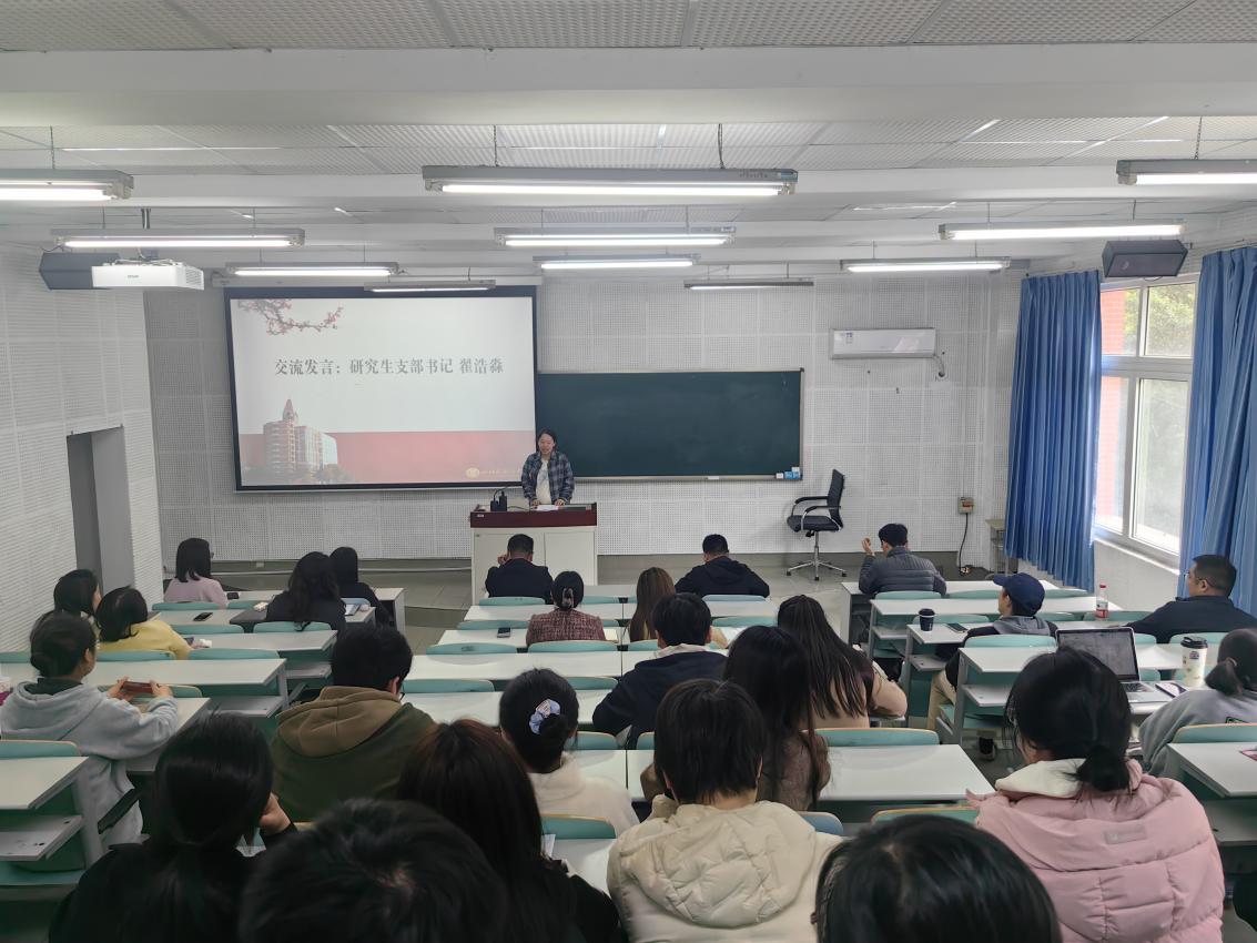在交流发言环节,学院研究生党支部书记翟浩淼老师、国家级一流课程负责人许劲老师分别结合工作实际作交流分享。