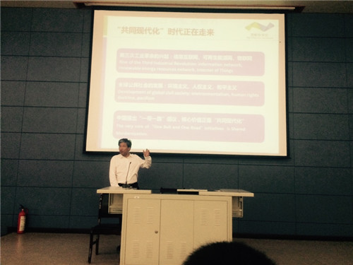 首先,柯银斌教授阐述了“传统现代化”与“共同现代化”的区别。传统的现代化建立在以不断提高的不可再生资源的消耗上,单个民族国际采取包括战争在内的以竞争为主的方式,发展成果由本国及盟国独享,产生的问题却由其他国家面对。因为不可再生资源的有限性,几十亿发展中国家人口规模对资源需求的巨量性,自由竞争式资本主义的扩张性及环境问题的全球性,使得传统的现代化道路已经走向尽头。而随着以信息互联网、可再生能源网和物联网为标志的第四次工业革命的兴起,以环境主义、人权主义、和平主义为基础的全球公民社会的发展,及中国的和平崛起,未来“传统现代化”将被“共同现代化”取而代之。“共同现代化”的基本特征在于:大量使用可再生资源,多个不同文明的国家(人口规模千万级、亿级、几十亿级),以合作为核心,禁止任何战争,市场化、工业化、城市化、信息化、全球化同时共进,国家之间共同负责,最终实现互利共赢。