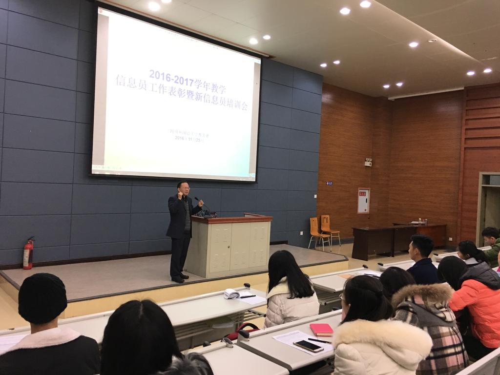 2016年11月25日,2015-2016学年教学信息员工作表彰暨新信息员培训会在西区教学楼B栋学术报告厅举行。教务处副处长姜孟、质量管理科全体老师以及各院系近200名学生教学信息员参加了此次会议,会议由教务处质量管理科科长余晓梅主持。