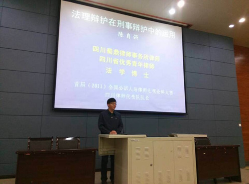 23日上午,在我校西区b栋学术报告厅,四川蜀鼎律师事务所陈自强律师做了一场题为“法理辩护在刑事辩护中的运用”的学术演讲。陈自强律师是四川省优秀青年律师、刑法学博士、首届全国公诉人与律师论辩大赛四川律师论辩队长。讲座由国际商学院国际经济法系主任衡爱民副教授主持,法学专业师生参加了本次活动。