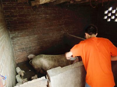 在江津参加社会实践的志愿者正在帮农户喂猪