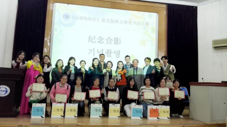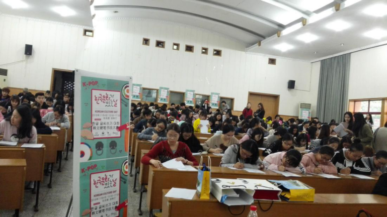 值韩文创立570周年之际,为弘扬优秀而优美的韩文、进而弘扬韩国文化,第五届韩文硬笔书法大赛于11月4日下午在培英楼放映厅顺利举行。此次硬笔书法大赛由重庆市世宗学堂与我校东方语学院共同举办,世宗学堂韩方代表朴宝恩老师、东方语学院的领导和老师们莅临现场,有五百多名学生参加了比赛。