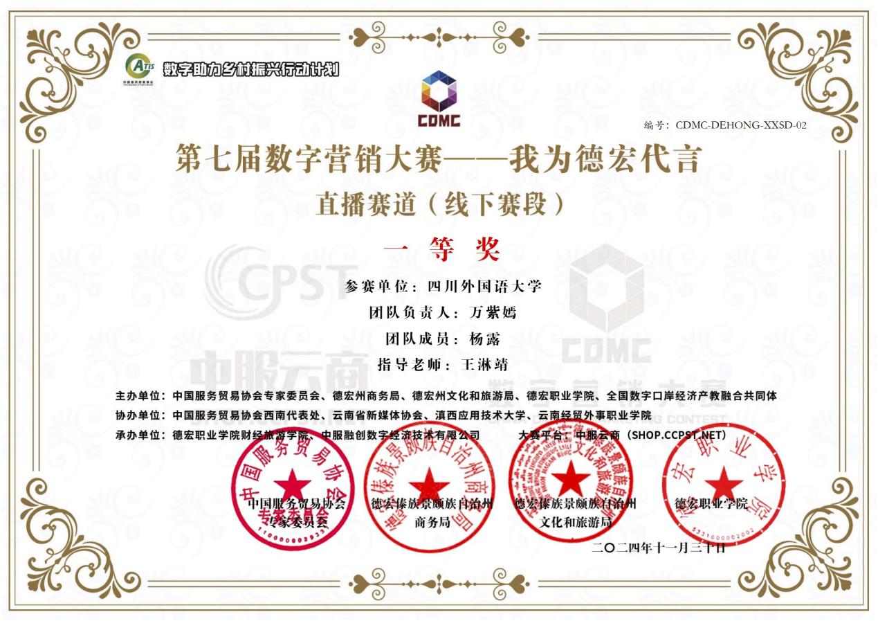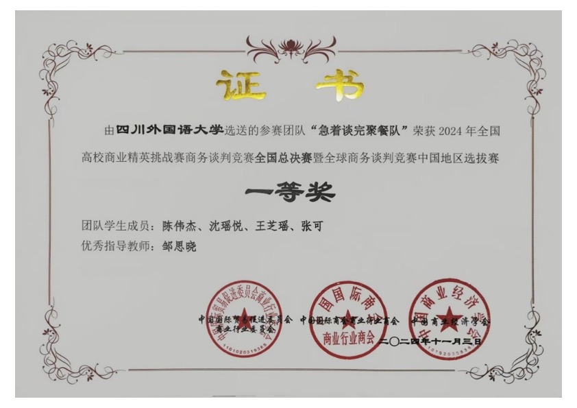 同学们在多项其他全国级创新创业赛事的角逐中同样表现卓越、硕果累累。国际金融与贸易学院陈伟杰、王芝瑶、张可等,王子涵、石婧雅等,李珂、徐粒等,向超、孟艾铭等,苗涵蓉、张宸溪等多支团队,分别在 2025 年全国高校商业精英挑战赛的商务谈判竞赛、国际贸易竞赛中斩获一等奖;翻译学院 “这很难评” 团队(陈俊烨等)同样在该赛事商务谈判竞赛中夺得一等奖,国际法学与社会学院吴相雨、钟茗卉、肖飞燕团队则在赛事涉外商事法律服务赛道全国总决赛中获一等奖;在 “商谈赢家杯” 全国大学生商务谈判竞赛中,国际金融与贸易学院陈伟杰、王芝瑶等,李珂、王振宇等,向超、孟艾铭等团队均拿下一等奖;国际金融与贸易学院万紫嫣、杨露团队在第七届数字营销大赛 —— 我为德宏代言直播赛道线下赛段中荣获一等奖;商务英语学院马嘉灿在 2025 年 “科创杯” 大学生数学建模竞赛数模知识竞赛赛道国赛中斩获一等奖,充分彰显了学校学子在商务谈判、国际贸易、数字营销、数学建模等多个领域的扎实专业功底与出色创新实践能力。