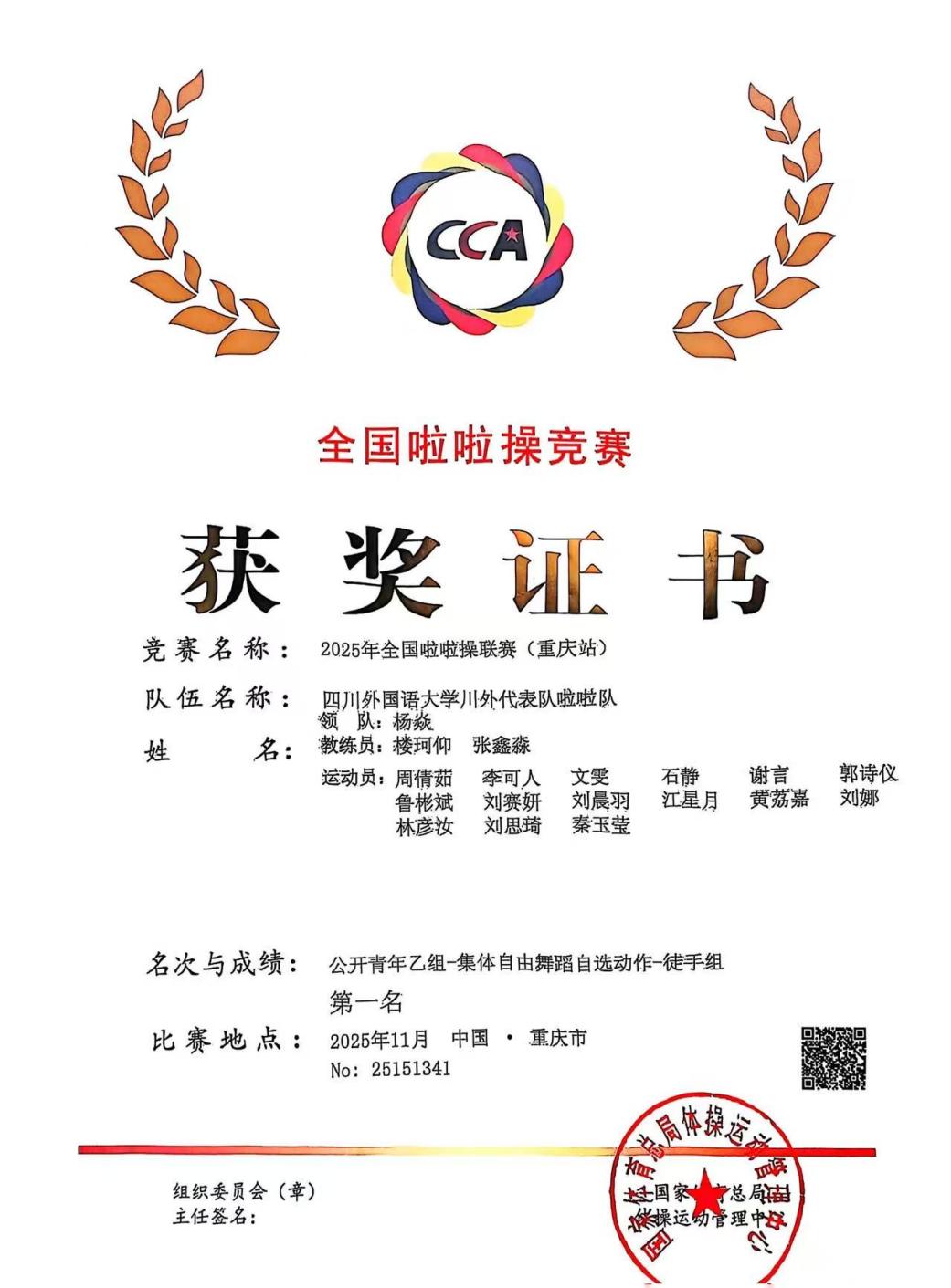 文化创意领域,新闻传播学院唐艺萌获2025西部陆海新通道视听公益广告大赛视频类三类扶持作品;体育赛事中,国际工商管理学院张鑫淼团队获 2025 年全国啦啦操联赛(重庆站)公开青年乙组集体自由舞蹈第一名,展现了川外学子德智体美劳全面发展的良好风貌。