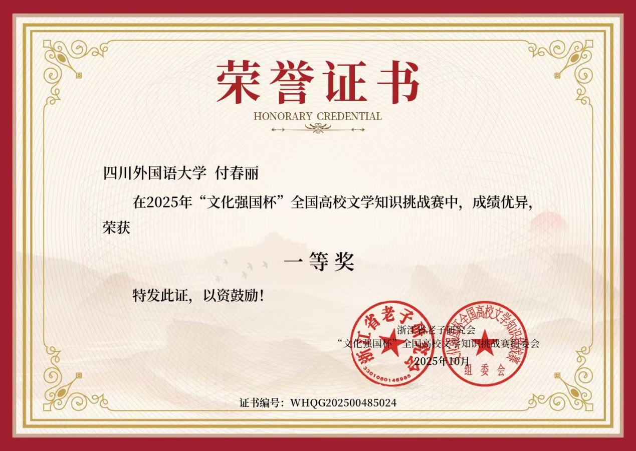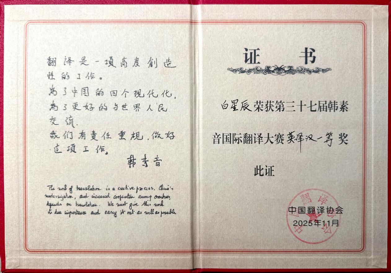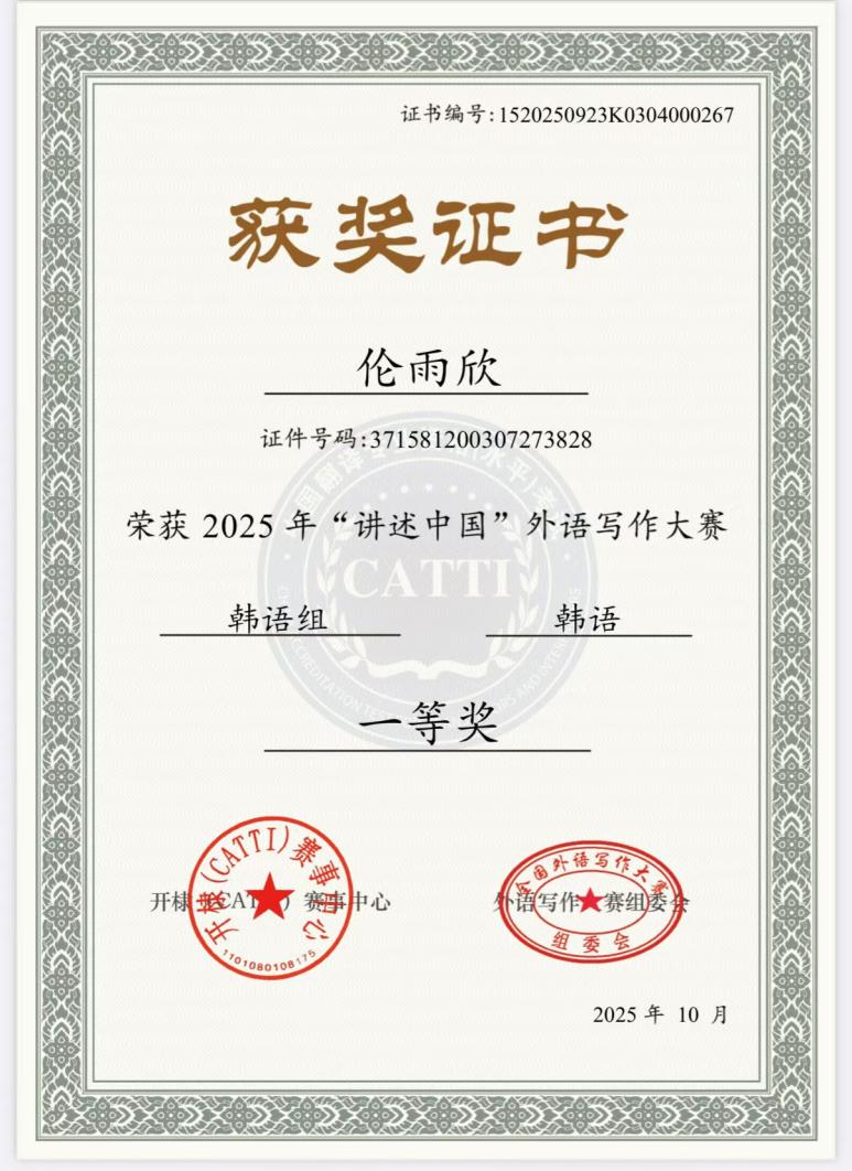 我校学子在全国其他语言类赛事中同样表现亮眼,斩获多项重磅荣誉。日语学院陈玺妃在第十九届中华全国日语演讲比赛西南赛区与顶尖选手同台竞技,以总排名第二的优异成绩夺得特等奖并获东京总决赛资格;翻译学院白星辰、东方语言文化学院张梦真、金佳怡及伦雨欣分别在第三十七届韩素音国际翻译大赛(英译汉)、2025 年多语种文学翻译大赛(阿拉伯语组)、2025 年中阿在校大学生翻译比赛(汉译阿)及 2025 年 “讲述中国” 外语写作大赛(韩语组)中斩获一等奖,展现了顶尖的翻译与写作专业能力;西方语言文化学院王雨珊凭借扎实的英语功底,夺得第四届 “BETT 杯” 全国大学生英语阅读大赛(初赛)一等奖;东方语言文化学院郑紫涵在第三届中韩友好全国大学生韩语演讲比赛中脱颖而出,荣获全国季军,成为全国韩语演讲领域的优秀代表,充分彰显了学校学子在多语种表达、跨文化交流及专业语言应用方面的深厚积淀与综合实力。