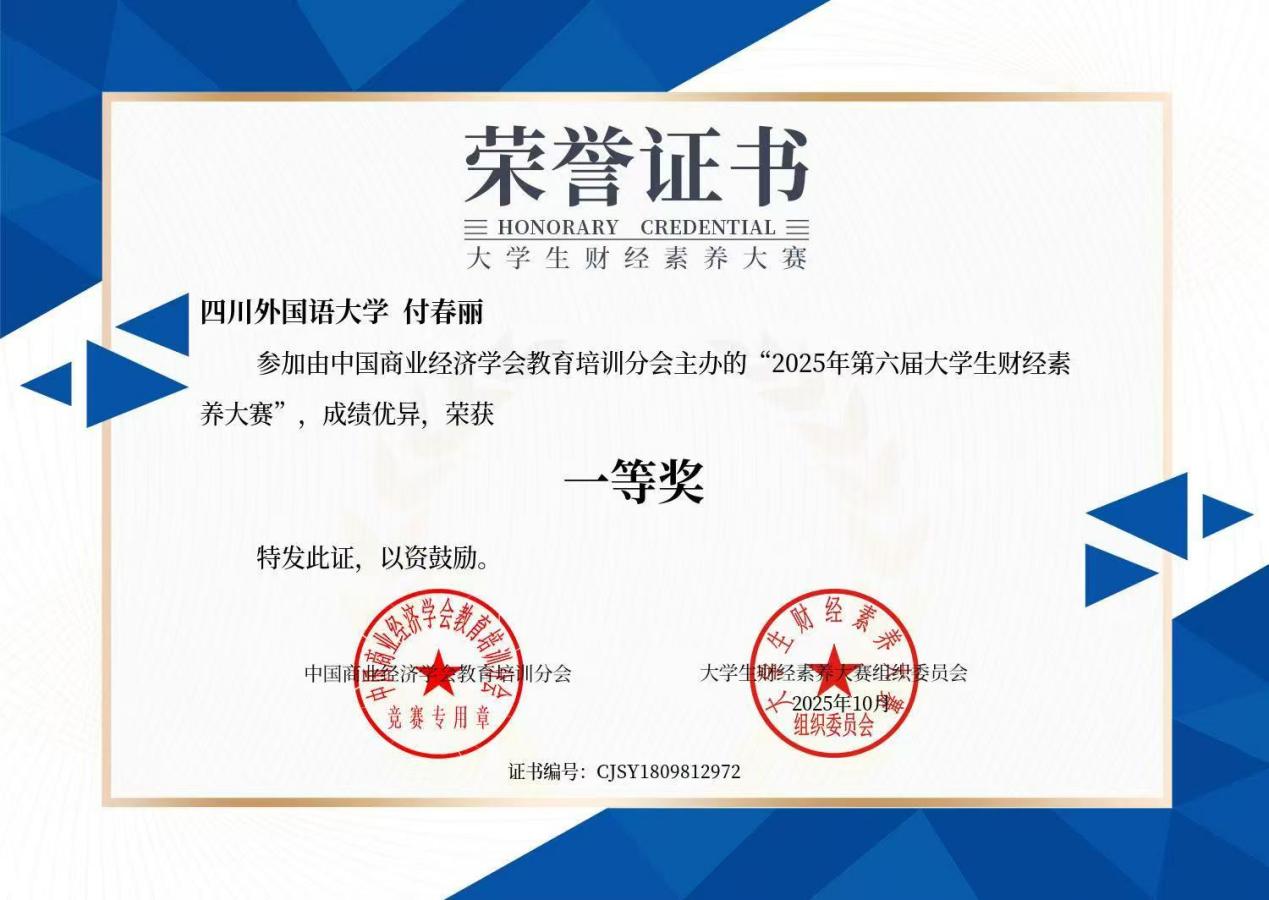 同学们在综合类赛事中斩获多项一等奖,表现亮眼。国际法学与社会学院付春丽凭借扎实的知识储备与出色的赛场发挥,一举拿下2025 年第六届大学生财经素养大赛和 “文化强国杯” 全国高校文学知识挑战赛两项全国一等奖;国际工商管理学院黄馨雅、段海尘、王梦雪团队在全国税收风险管控案例大赛中展现出专业的案例分析与风险管控能力,成功斩获全国一等奖,充分体现了学校学子在文学知识、财经素养、风险管控等多个领域的综合实力与专业素养。