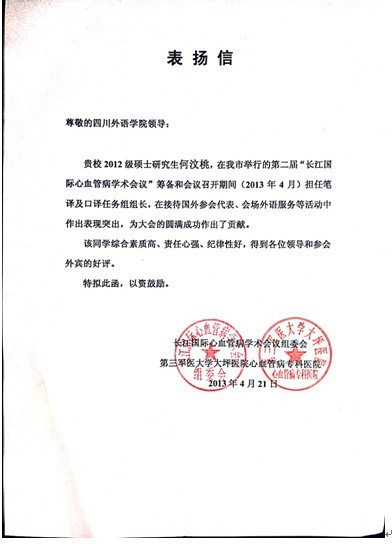 年4月底,第二届长江国际心血管病学术会议在重庆举行。我校翻译学院牟利莎、莫雪梅、何汶桃、黄莺、瞿经文、陈文丽、郝姣、曾圣洁、闫晓龙、明思吉、贺丽菁、李静等十位同学作为英语志愿者给大会提供了高质量的语言服务。
