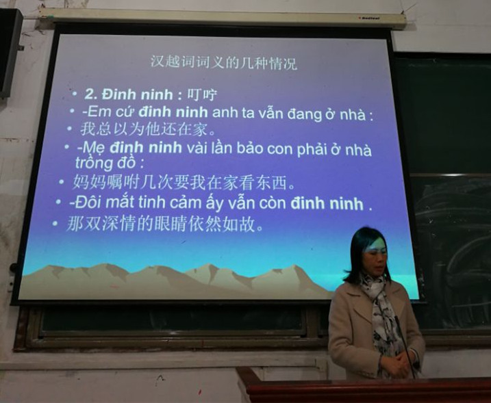 本次讲座从汉越词定义、分类、具体例子几个方面深入浅出地向越南语系全体师生们全面讲解了越语中的汉越词及其翻译问题。讲座期间,黎巧萍博士与师生们共同交流、探讨,特别指出中越文互译时,中国译者常见错误。同学们在讲座期间积极参与讨论、发表意见,受益匪浅。最后,黎巧萍博士鼓励同学们在积极学习的同时要关注时事并参与实践,把自己定位为通晓中越双文的高级人才,将来为党、国家和人民的事业做出贡献。