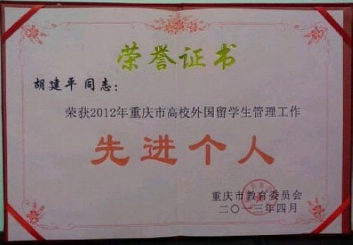 重庆市高校外国留学生培养与管理工作研讨会于 2013年4月24日下午在重庆大学a校区主楼召开。我校留学生部原主任胡建平同志荣获2012年重庆市高校外国留学生管理工作先进个人。