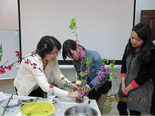 3月26日下午,日本国驻重庆领事馆总领事夫人光冈道子在日语系办公室进行了花道表演。道子夫人首先用寓教于乐的方式讲授了花道起源于中国,传入日本后根据日本人的喜好不断演变并得到蓬勃发展的历史,随后亲自演示了插花艺术,并现场教授同学们插花的技巧和秘诀。