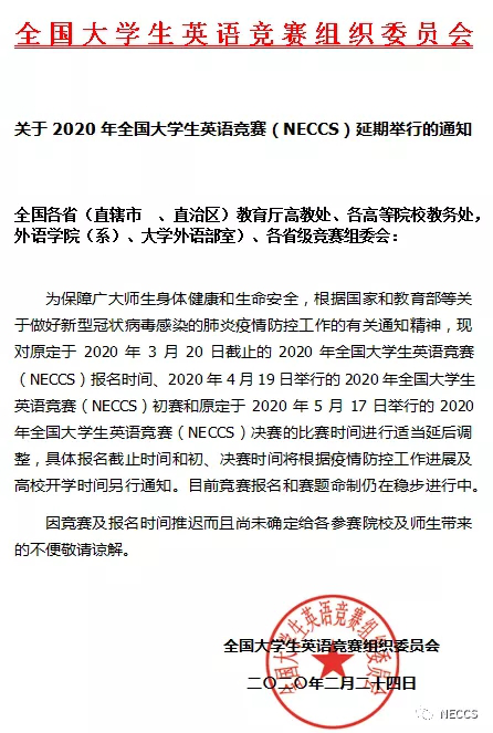各位同学,因为疫情原因,原定于4月19日举办的大学英语竞赛初决赛时间将适当延后,具体延后时间将根据疫情情况以及开学时间另作调整,通知如下: