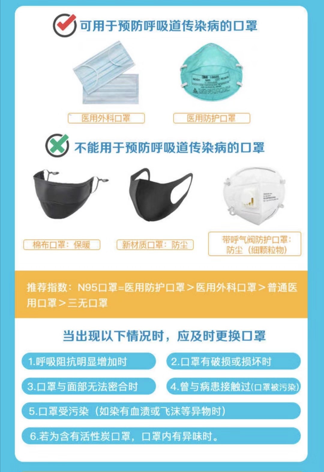 11.口罩可选用医用外科口罩、N95口罩。不管是哪种类型的口罩,防护效果都是有限的,需要定期更换。