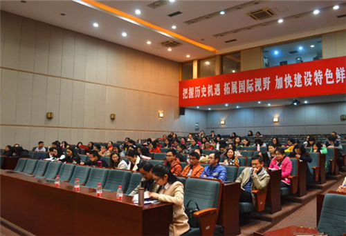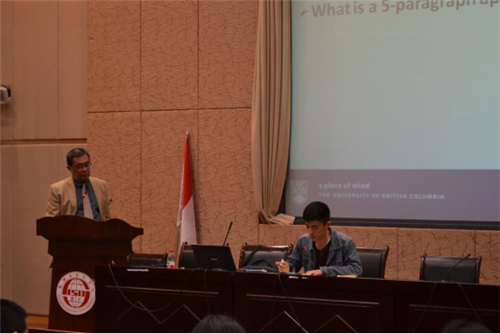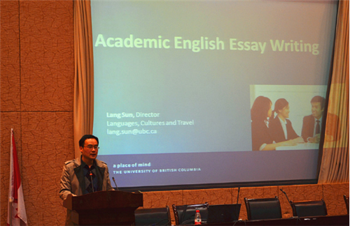 2016年3月14日晚,加拿大不列颠哥伦比亚大学(ubc)继续教育学院语言文化系主任孙浪教授莅临我校,在东区宏文楼二楼国际报告厅举行了题为“英语学术论文写作”的讲座。讲座由翻译学院副院长杨志亭主持,中外文化比较研究中心段俊晖教授、国际交流与合作处邱晓凤老师及翻译学院学子200余人聆听了讲座。