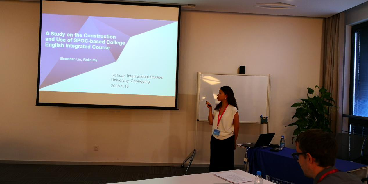 8月18号下午,刘姗姗老师和马武林教授做了题为“A Studyon the Construction and Use of SPOC-based College English Integrated Course”(大学英语综合教程SPOC建设及应用研究)的小组发言。刘姗姗老师详细向各位专家介绍了我校大外部依托《新标准大学英语》慕课开展的翻转课堂教学实践。该报告向各位专家揭秘了大学英语翻转课堂的具体操作办法,给与会专家留下了深刻的印象。
