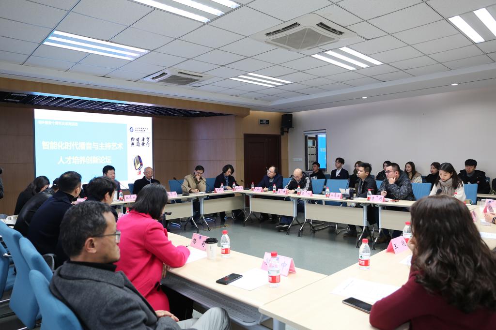 11月30日下午,智能化时代播音与主持艺术人才培养创新论坛在行政楼C517会议室成功召开。我校副校长李小川,教务处处长严功军,重庆市播音主持协会会长韩咏秋,重庆大学美视学院、播音主持系副主任张晓玲,西南大学新闻传媒学院、播音主持系主任张秋丽等重庆市教育界、播音界的权威同行参加了本次论坛。论坛由新闻传播学院副院长郭赫男主持。