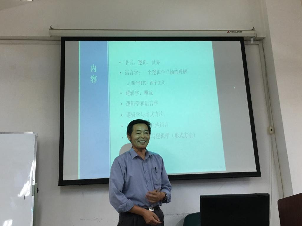 接着,周教授从逻辑学的基本类型、历史、名称演变、逻辑的作用、分类以及语言学家们对逻辑学的看法等方面介绍了逻辑学的概况。周教授提出,从逻辑学角度出发开展的语言研究包括两种形态、四个时期。他指出,形态由传统逻辑发展为现代逻辑的同时,自然语言推理的混沌时期也逐渐演化为以自然语言为本的正本时期。周教授谈到形式方法和逻辑学的联系,并详细解释了何为推理、推理形式、正确的推理形式和形式方法。最后,周北海教授总结道,“语言不是直接表现或对应于现实世界,而是有一个中间的‘认知构建’层次将语言表达和现实世界联系起来。在这个认知中介层,人面对现实世界形成各种概念和概念结构”。