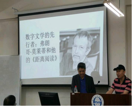 在听众的热烈掌声中,陈永国教授开始为大家讲授令人耳目一新的数字文学研究,陈永国教授认为,数字文学这一名称比数字人文更能体现弗朗哥·莫莱蒂的文学观。陈教授引出了弗朗哥·莫莱蒂较早提出并实践的“距离阅读”,指出了学术界对这一名词的误译并指出“距离阅读”在数字文学研究中的重要含义。在《世界文学猜想》中,莫莱蒂认为世界文学研究也许可以为文学领域提供一种分析与综合的关系,而不仅仅依靠文本细读,这样文学史不仅是一种新的写法,更是一种更为雄心勃勃的设计。“距离”是获取知识的一个条件,是阅读与文本之间的距离。莫莱蒂在研究世界文学时发现文学研究者大多集中于西欧文学,即使是西欧文学,也仅仅是研究所发表之文学的1%的经典,也就是说,还有99%的文学未被阅读,如果文本细读仅仅依赖这样的经典,则无法完成文学史的建构。莫莱蒂在“文学屠宰场”中接着回答,在世界文学体系中,各国文学间的关系是不平衡的,小说中外来形式与本土素材融合的过程中反映了一种权力关系,黑格尔说“世界的历史是世界的屠宰场”,那么,文学的历史就是“文学的屠宰场”,被淹没的文学之多是文本细读根本无法完全囊括,由此而见,文学史的撰写也必须采取新的方法。