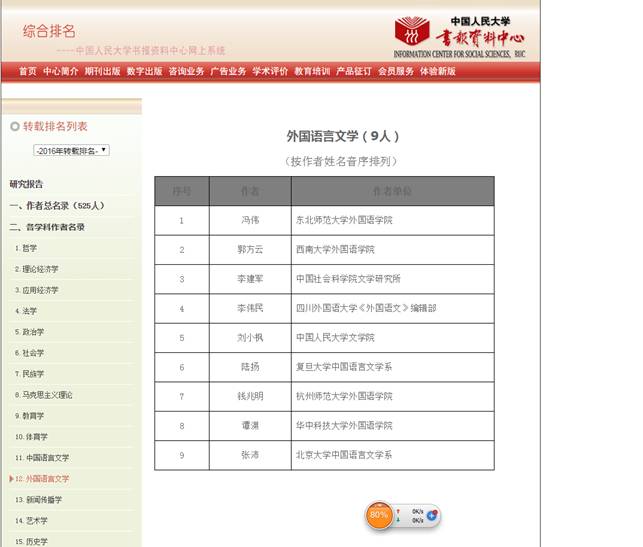 近日,由中国人民大学人文社会科学学术成果评价研究中心与中国人民大学书报资料中心联合研制的“复印报刊资料重要转载来源作者(2016年版)”首次发布。该成果根据2013-2015年转载数据和同行专家评议结果,按哲学、理论经济学、应用经济学、法学、政治学、社会学、民族学、马克思主义理论、教育学、体育学、中国语言文学、外国语言文学、新闻传播学、艺术学、历史学、地理学、工商管理、农林经济管理、公共管理、图书情报与档案管理20个学科评选,共计525名作者入选。其中,外国语言文学学科共有9人入选,我校李伟民教授榜上有名。