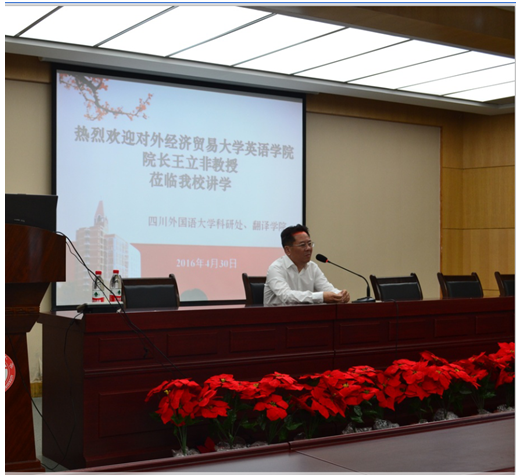 年4月30日下午,对外经济贸易大学英语学院院长王立非教授莅临我校,在西区行政楼a栋609会议室举行题为《国际化与信息化对翻译人才能力要求的swot分析》的讲座。讲座由翻译学院院长祝朝伟教授主持,英语学院退休教师、学校本科教学督导组成员廖才玺教授,翻译学院副院长杨志亭副教授、翻译学院硕士生导师李龙泉教授及近120名学生聆听了讲座。