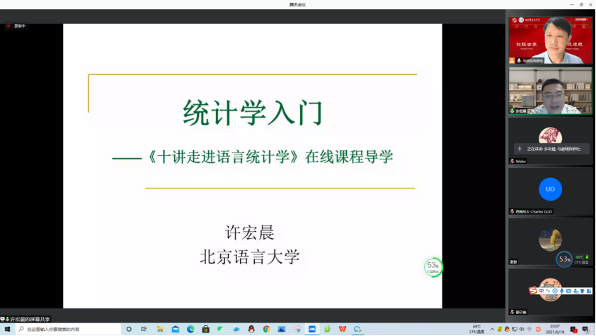 科学研究,统计先行。针对我校部分青年教师统计学基础薄弱问题,科研处和教师发展中心特邀北京语言大学许宏晨教授于2021年6月18日进行《统计学入门》线上讲座。该讲座也是我校购买的“教师发展智慧研修空间”众多在线课程之一《十讲走进语言统计学》的导学课。讲座由科研处马武林教授主持,吸引了学校青年教师、博士研究生和硕士研究生以及来自北外、上外、山东大学、西南科大等高校听众150余人。