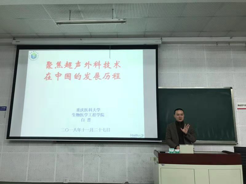 2018年11月27日下午,重庆医科大学生物医学工程学院院长,重庆市著名眼科专家白晋教授在四川外国语大学宏文楼1-1教室,举行了题为“聚焦超声外科技术在中国的发展历程”的科普讲座。本次讲座旨在让师生更深入的了解海扶医疗科技有限公司以及聚焦超声技术的发展历程。