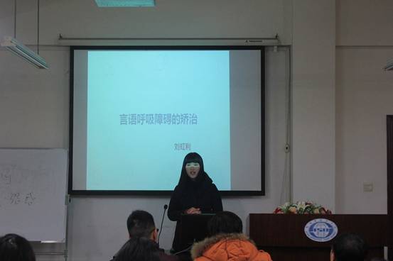接下来,刘虹利同学针对呼吸方式异常、呼吸支持不足、呼吸与发声不协调三大障碍分别讲解和演示了相应的促进治疗方法。其中,呼吸方式异常的放松训练主要包括生理腹式呼吸训练、嗯哼法、拟声法和数数法;呼吸支持不足的放松训练则包括快速用力呼气法、缓慢平稳呼气法和逐字增加句长法;呼吸与发声不协调的放松训练主要包括唱音法、啭音法、气息式发音法和甩臂后推法。她表示,训练方法的操作要领并非一成不变,在临床过治疗程中治疗师在充分考虑到个体差异的前提下可适当发挥主观能动性,做到随机应变,因材施教。