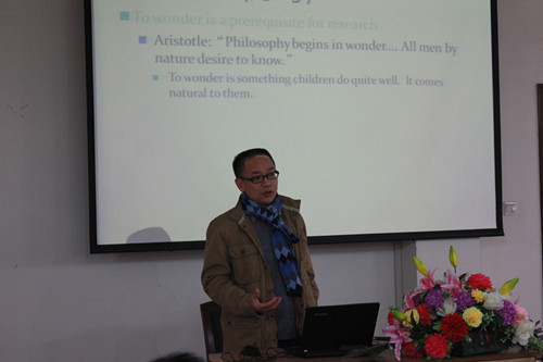 冯光武教授首先从宏观角度指出,做学问并不是一件难事,但是想做好学问,必须先了解自己。冯教授概括人文社会科学的研究特点:理解、领会、反思、阐释、评价。随后,冯教授指出做学术研究的首要要素:好奇心。他指出,一定要有好奇心,善于发现别人观点和理论中的问题所在,要敢于挑战权威。要达到这一点,则必须依靠大量阅读。冯教授进一步用自己的研究为例说明发现别人研究中的问题并展开研究的方法。冯武教授运用批判的方法,以生动形象的例子和扎实严谨的学术态度向大家展示了其学术研究之路,赢得全场师生热烈的掌声。