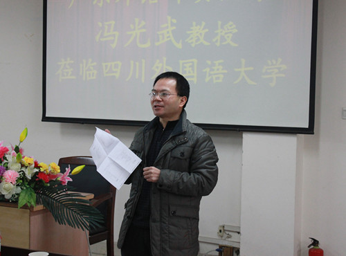 2014年12月12日上午10点,应我校教务处邀请,广东外语外贸大学英文学院教授、博士研究生导师、富布莱特学者、教育部高等学校英语专业教学指导分委员会秘书长、我校校友冯光武教授在博文楼四楼报告厅,为我校师生作了题为“我的语言哲学研究路径”的精彩学术讲座。讲座由四川外国语大学教务处副处长姜孟教授主持。我校部分青年教师及博士生、硕士生聆听了本次讲座。