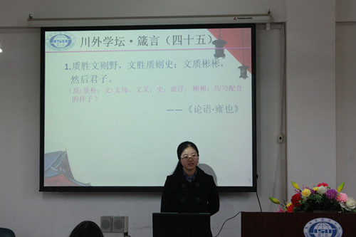 首先,2013级研究生田莉莉同学向大家分享了她精心挑选的两则箴言:“质胜文则野,文胜质则史;文质彬彬,然后君子——《论语·雍也》”;“忠告而善道之,不可则止,毋自辱焉——《论语·颜渊》。”从而借此告诉大家做人要懂礼数,知荣辱,以及知晓为人处事的道理。