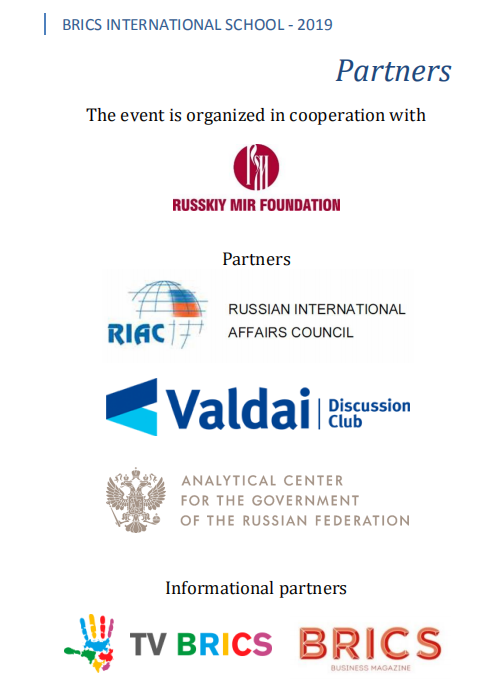 该项目由俄罗斯金砖国家研究国家委员会、亚历山大•戈尔恰科夫公共外交基金会共同主办,旨在通过金砖五国青年在政治、经济、文化等议题领域的探讨与交流,为金砖国家未来合作培养更多的后备专家。为此,该项目邀请了来自金砖五国致力于金砖各领域研究的专家学者为国际学校的青年学员授课,以拓宽他们的专业视野,夯实他们的专业基础。除了俄罗斯本国的学者外,该项目今年邀请的国外专家分别来自巴西应用经济研究所、印度观察家研究基金会、南非自由州大学、中国四川外国语大学。