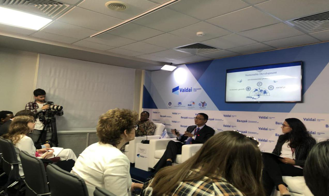 28日下午,朱天祥应邀在俄罗斯著名的瓦尔代俱乐部发表了题为“金砖国家发展目标:中国路径”的演讲,分别从什么是金砖国家发展目标、中国对金砖国家发展目标的贡献、以及中国在减贫问题上的特色实践等方面向与会代表阐释了在中国特色社会主义思想指导下中国共产党领导全国各族人民为推动实现联合国2030可持续发展目标所贡献的独特智慧和有益方案。演讲后,朱天祥还回答了现场学员和其他专家学者关于金砖国家集体行动困境、金砖+模式的走向、中国关于促进全球经济开放包容增长的立场、中国的减贫举措、中国青年就业现状等问题。