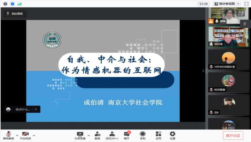 11月17日晚上6点30分,由四川外国语大学国际法学与社会学院举办的“社会学专业办学十周年(2011-2021)学术名家讲座”第十四讲通过线上腾讯会议成功举行。南京大学社会学院院长、博士生导师成伯清教授应邀作题为《自我、中介与社会:作为情感机器的互联网》的学术报告,共计230余名师生聆听了本次报告。