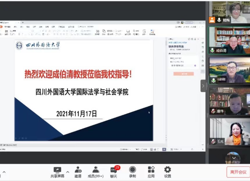在讲座开始前,成伯清教授与我院部分教师共话我校社会学学科专业发展,以线上座谈会的方式对我院社会学学科专业建设进行指导。在交流会谈中,学校党委副书记苟朝莉首先致欢迎辞,她向成伯清教授表达了感谢,感谢成教授对我校社会学学科专业发展的支持,感谢成伯清教授百忙之中不辞辛苦为我院师生讲学,殷切希望成教授对我校社会学学科专业发展把脉导航,提出宝贵意见。接着,国际法学与社会学院院长林移刚教授就学院整体概况、学科专业发展历程、师资力量、办学特色、办学成果、未来发展中面临的困难及挑战进行了介绍,并表达了希望得到成伯清教授指导的真诚期望。成伯清教授就前述提到的各种问题与参会老师们进行交流,他肯定了川外社会学学科专业目前已取得的成就,提出了希望借助外语院校的独特优势,重视跨学科合作,坚持及拓展“专业+外语”的复合学科专业特色,如和外语专业科研团队合作,在国际刊物发表学术论文。同时他也认为学术积累是一个长期的过程,为了学科专业的长远发展,老师们还需继续努力,再接再厉,凝聚主题、打造方向,产出更多具有影响力的代表性成果。