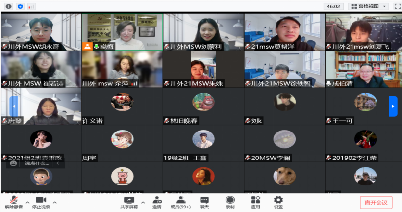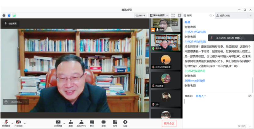 成伯清教授的报告极大激发了同学们的学习兴趣和讨论热情,同学们在留言区踊跃提出自己的看法、问题和困惑,希望向成老师请教。如朱姝同学提出了未来在互联网继续高速发展的情况下,我们该如何保持相对理性的问题;刘夏飞同学提出了我们应该如何约束规范互联网的发展以及促进新的社会关系的形成;胡永奇和刘蒙利同学则分别提到了我们如何应对单调乏味的日常生活以及社会工作如何有效介入以减少服务对象内心的孤独感等问题。成伯清教授同学们提出的问题都耐心地一一解答,与大家亲切交流。同学们也纷纷留言,表达对成老师的感谢和对报告的高度认可。