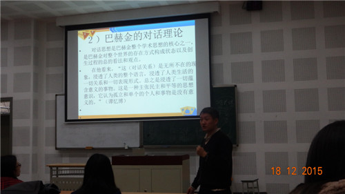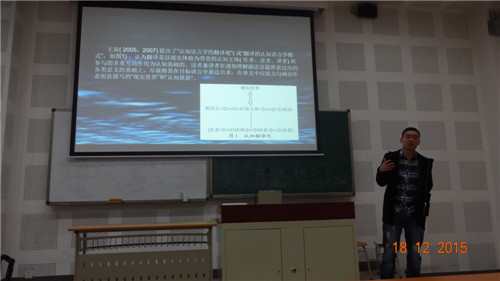 最后,原卫国博士对两位同学的讲述进行了精彩点评,并由表及里、深入浅出地讲解了对话句法理论的一些关键点。他诙谐幽默地引入现实生活中的语言实例,在与同学们进行了热情的互动交流,同时也恰当合理地切入对话句法理论。原博士以“平行”、“映射”、“共振”、“图解”、“格式塔”等概念为切入点,以小见大,结合前人的观点从微观和宏观两个层面对整个对话句法理论作了详实的报告。最后,原博士基于语言的三个平面系统,从巴赫金的对话理论、评价系统的介入系统(系统功能语言学)和认知功能语言学三个角度对对话句法理论进行了宏观的介绍和讲解。
