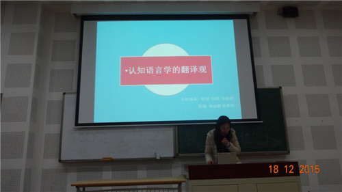 荣婷婷同学简要介绍了传统语义观对翻译的影响。她分别就传统语义观中的“指称论”、“观念论”、“功用论/语境论”、“替代论”及“关系论”等结合实例做了简单的阐述。她深入浅出地介绍了解释派哲学的语义观对翻译的影响及不足之处,进而引入认知语言学。最后,她以西方哲学三大转向为切入点,指出翻译理论和认知语言学的共同理论基础,详细介绍了基于认知语言学的翻译观,并指出认知翻译观的“体验性”、“多重互动性”、“创造性”、“语篇性”、“和谐性”和“两个世界”等特性。她在讲座中多次通过“哲学—语言—翻译”、“现实—认知—语言”、“作者—文本—读者”三对关系就认知语言学观点对翻译的指导作用做了精彩的阐释。