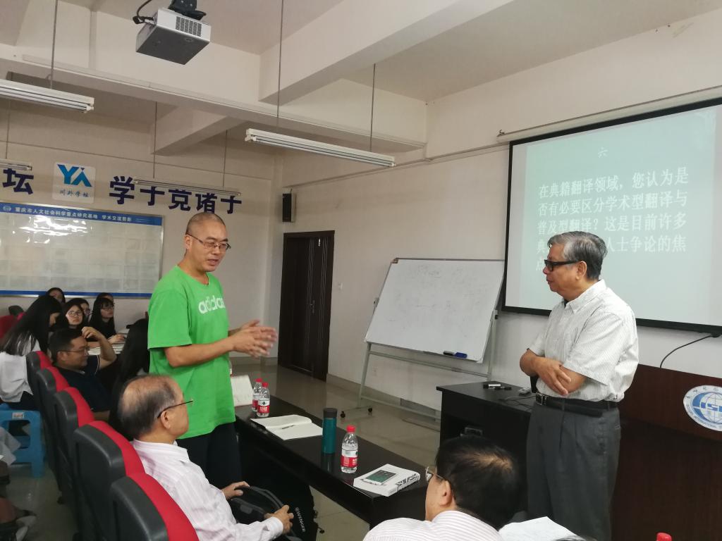 最后,潘教授与在座教授们围绕典籍翻译中的“术语”、“翻译批评”等问题展开了讨论。活动尾声,王寅教授对潘教授的发言进行了精彩的总结,高度赞扬了潘教授在当前人文学科研究趋势下建构的典籍翻译话语体系,至此,本次讲座在一片掌声中落下帷幕。
