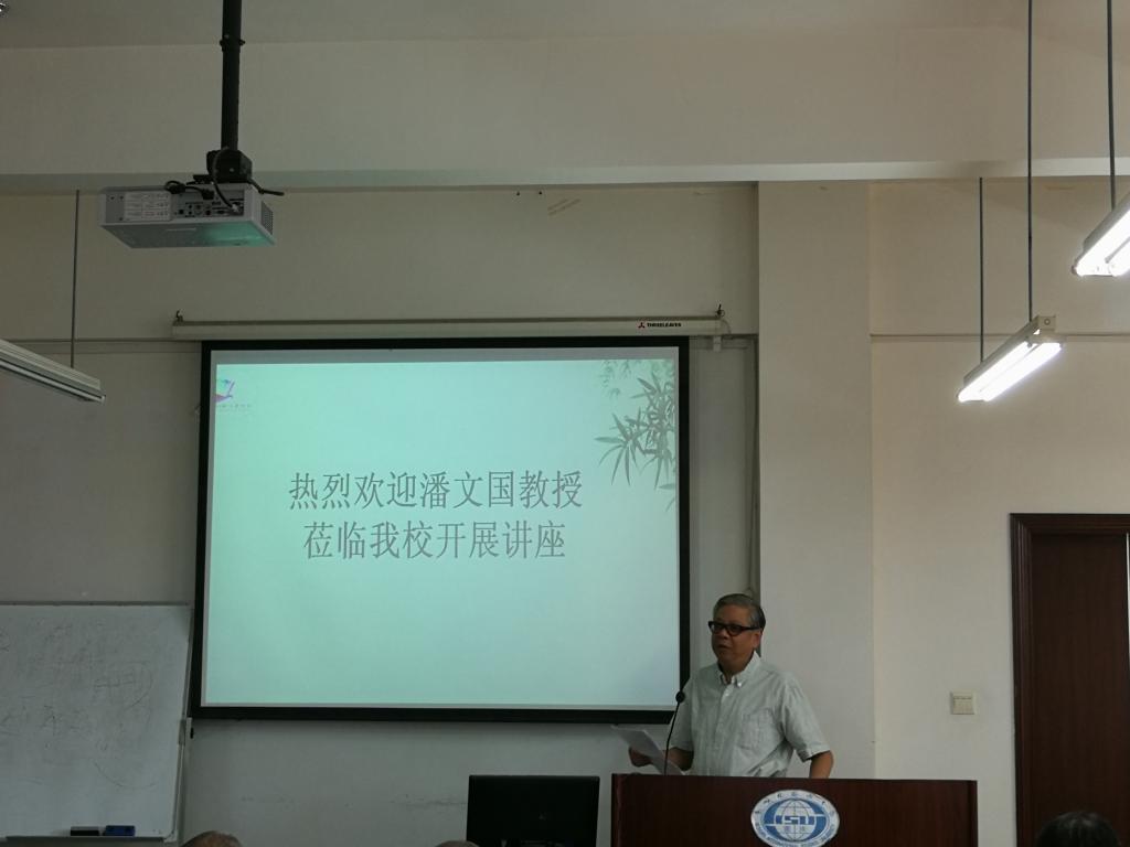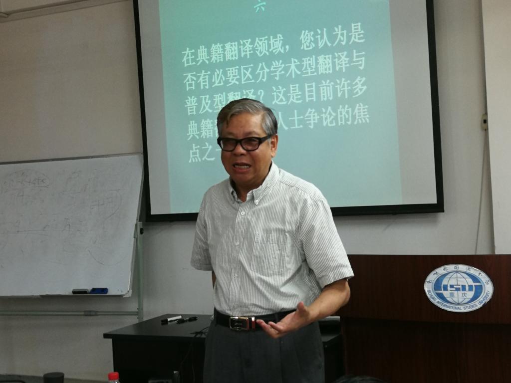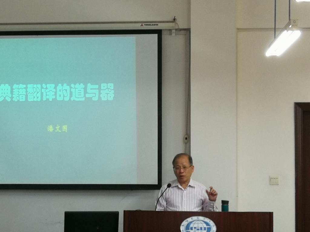 首先,潘文国教授在讲座中提出了对中国典籍翻译问题的看法。他指出,典籍是中国传统思想、文化、文学、艺术的璀璨结晶,典籍翻译处于中译外领域的核心地带,对中国文化海外传播具有重要意义,而典籍翻译的特殊性体现在它必须突破对原文理解的三大关与外语表达上的三大关。然后,潘教授针先是引用吕叔湘先生的话,就对原文理解过程中如何突破三大关进行了解释。他指出,翻译者要过语言文字关,必消除“两张皮”问题;要过古代文化关,必知历史;要过中国文化核心词语关,必长期积累。如若不然,定义中国典籍中诸子百家的“道”、“气性”、“理”、“阴阳”,文学艺术中的“韵”、“味”、“神”、“骨”、“比兴”将寸步难行。接着,他又阐释了如何突破外语表达上的三大关。他讲道,只要人处在母语环境下,母语便永远是外语的“天花板”。在外语表达过程中,找到如“亭阁台榭”、“永字八法”、“宫商律吕”此类具体名称的对应语是一大关,这关涉及到中国文化体系,因此要解决这一问题需在英文中建立相应的体系。第二关在于难以为一些抽象的概念找到统一的译法,而纠编旧译又是一关,对此,潘教授提出,在有限条件下译者只得运用“格义”的方法,借以削弱翻译过程产生的阻力。随后,潘教授就典籍翻译的四大核心问题,即:“译什么”,“给谁看”,“谁来译”以及“怎么译”谈了自己的看法。其中他主要指出,目前中国典籍翻译作品复译率较大,译出量少且对象多为学外语的中国人。接着,他在“道”的层面上阐释了“文章翻译学”对典籍翻译领域的启示,并就“器”——翻译实践中的具体问题——谈了实际的操作原则。