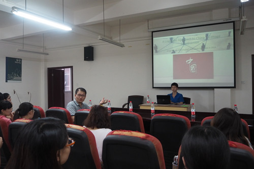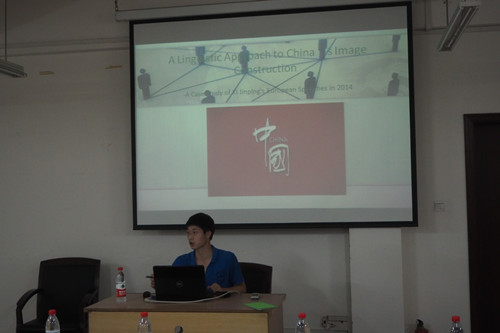 在大家热烈的邀请之下,蔡向前就其论文“中国形象建构的语言分析”与大家进行了交流。首先,蔡向前指出中国提升国际形象的重要性,并创新地提出从后现代主义视角进行文本研究;紧接着以2014年习近平主席在欧洲的演讲为研究对象,用建构语言结构分析模型理论,从词汇、句法和语篇进行了定性和定量的分析和讨论;最后得出结论,即语言对中国国际形象的提升具有建设性意义。