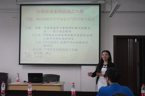 2015年5月14日晚,科研沙龙之2012级硕士研究生毕业论文写作经验交流会在博文楼四楼报告厅如期举行。本次交流会由会长万婷婷主持,参加交流会的主要代表研究生有2012级的蔡向前、甘霖、江小玲和陈冉。原卫国博士作为特邀嘉宾出席了本次活动。我校研究生积极参与,现场气氛活跃,学术氛围浓厚。