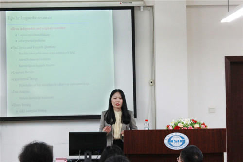 高哲老师的主题报告分为两大部分。首先,高老师讲述了她从四川外国语大学到香港中文大学的求学之路:从川外本科阶段博览四百多本图书,到凌晨一点仍在灯火通明的港中大图书馆里埋头苦读,这种对知识的渴望与对梦想的坚持,令在座的每一位学子感触良多。高哲老师还提及她在芝加哥大学的访学经历,其严谨的治学态度和永不放弃的拼搏精神深深地感染着每位同学。在第二部分,高老师详述了其论文《儿缀和子缀作为名词可数标记的探究—以徐州方言为例》的写作过程。她以自身经验为例,为同学们如何完成硕士论文提供了有益的借鉴。高老师建议同学们广泛阅读当下研究领域的最新动态,寻找理论支持,也可多借鉴博士论文,与此同时,她还鼓励大家保持坚持不懈的研究态度和批判精神。
