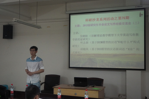 随后,邱晓凤同学以自己的毕业论文为例,介绍了论文的基本框架结构。她以《基于dci模型的汉语新词语“x帝”构式研究》为题,从研究动机、研究目标、研究方法、数据收集、理论框架、个案研究、数据分析、结论8个板块进行了讲解。她首先介绍了“x帝”构式的特征、前人研究的缺陷以及具体的研究目标、研究方法;然后结合所收集的366条数据,为大家阐释了数据分析的方法和原则;接着解释了dci模型理论框架,并以“影帝”作为个案研究,从语音层面、句法层面、语义层面、语用层面对汉语新词语“x帝”构式进行了分析,并得出了自己的结论。
