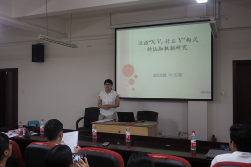 之后,叶志新同学以自己的论文《基于dcm模型的汉语“x vj—什么y”构式研究》为例,和大家分享了论文写作过程中的构思问题、选题问题等宝贵经验。她首先从认知语言学和构式语法理论角度分析“x vj-什么y”,提出dcm模型分析构式的形成机制,并通过dcm模型的建立,揭示去范畴化运作过程的动因和触发点;然后,通过“x vj-什么y”变体的语义演变规律,提出“疑问——否定”渐变链,修补前人在疑问句、反问句及否定句分类问题上的不足;最后,以语料库为手段,建立了“x vj-什么y”的小型封闭语料库,且对其进行分类统计,归纳该构式的句法特征、语义演化以及语用功能。