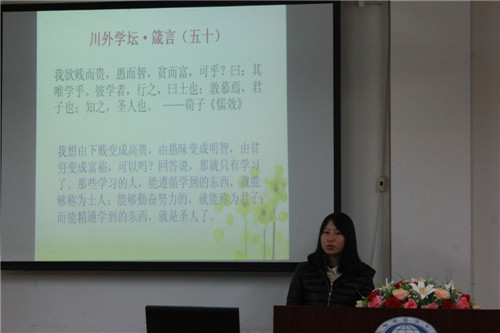 2015年12月24日晚,川外学坛“学子之星”学术讨论会在博文楼六楼报告厅如期举行。本次讨论的主题是“真理的生理性”,主讲人为2014级研究生郑贵兰和荣婷婷同学。讨论会由段继香同学主持,姜孟教授出席,各年级研究生参加了本次学坛活动。