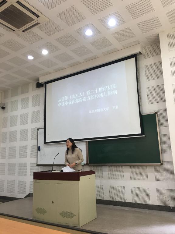 王老师以独特的视角带我们分析了二十年代初期越南南方文学的特点,其中重点对比分析了中国古代短篇小说《欢喜冤家》和越南仿作《卖玉人》的异同。王老师的讲座轻松有趣,内容丰富独特,很快吸引了同学们的兴趣。