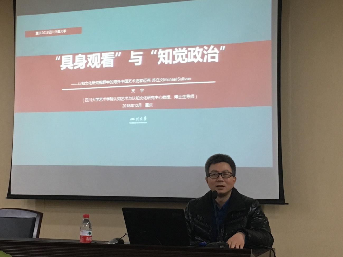 2018年12月27日下午三点,四川大学艺术学院支宇教授应邀在我校西区图书馆208会议室做了一场题为“‘具身观看’与‘知觉政治’—认知文化研究视野中海外中国艺术史家的迈克•苏立文(Michael Sullivan)”的讲座。讲座由我校博士生导师熊沐清教授主持,并有来自各院系的师生们参加,现场气氛热烈。