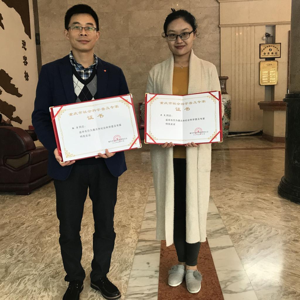 市社科联普及部副部长王刚宣读《关于命名第三批重庆市社会科学普及专家的通知》,并为社科普及专家颁发证书。我校张勇教授、吴昊副教授获批第三批重庆市社会科学普及专家。