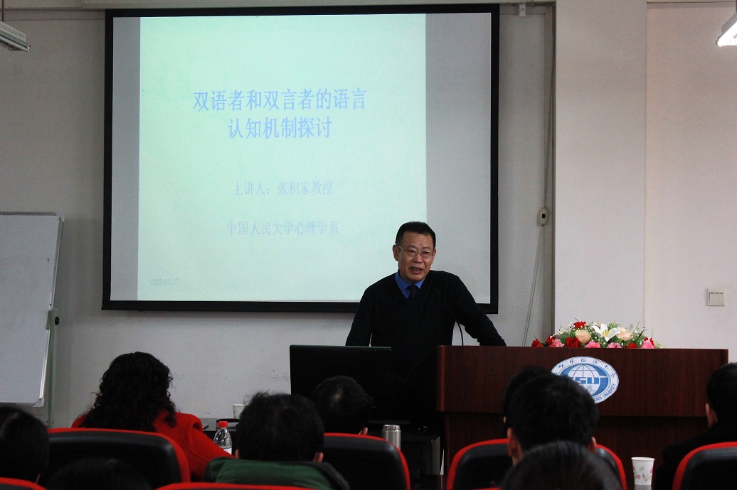 应我校研究生院邀请,著名心理学家、中国人民大学博士生导师张积家教授于2017年3月16日下午在博文楼六楼学术报告厅举行了题为“双语者和双言者的语言认知机制探讨”的学术讲座。讲座由王仁强教授主持,廖巧云教授、姜孟教授、赵永峰教授、刘玉梅教授、董遥遥教授、校内外青年教师,以及近百名博士生、硕士研究生参加了本次学术活动。